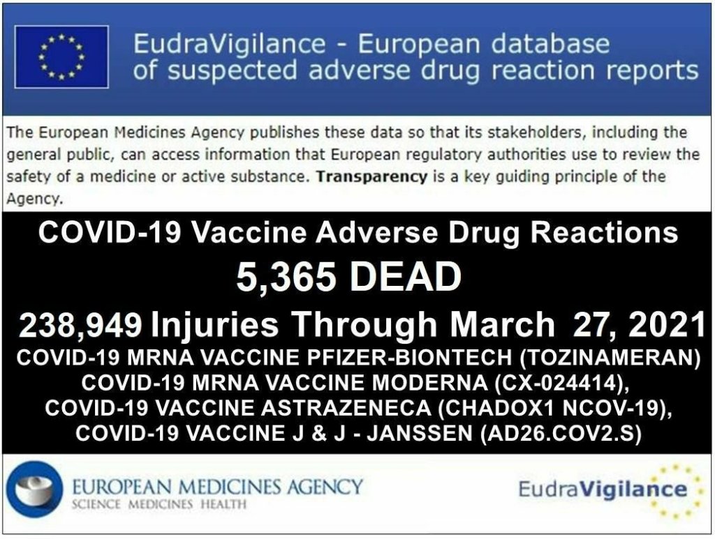 En la base de datos de reacciones adversas a medicamentos de la Unión Europea, llamada EudraVigilance, se reportaron 1 509 266 lesiones por la vacuna contra el COVID-19, incluyendo 15 472 muertes al 19 de junio de 2021. EudraVigilance solo acepta reportes de miembros de la Unión Europea, por lo que solo cubre 27 países. Es sorprendente que casi la mitad de todas las lesiones reportadas (753,657) están clasificadas como “graves”